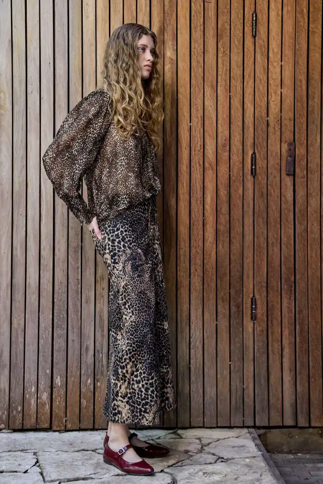 Falda 5 bolsillos confeccionada en gabardina estampado animal print 97,50% algodón 2,50% elastano. Hilo en camel. Su largo de referencia para el talle 26 es de 86cm. Posee un tajo bien largo para dar amplitud y comodidad. Su ruedo lleva pespunte simple.