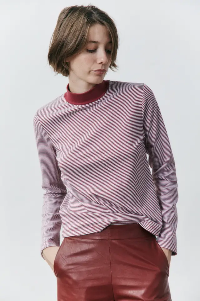Prenda confeccionada con género de punto compuesto por 96% poliester 4% elastano. Prenda de silueta regular, mangas largas y cuello media polera. El cuello esta realizado de la misma tela, pero liso, mientras que la prenda total, se confeccionó del lado rayado. Textil súper confortable, de características similares al polar. Puede usarse como prenda de primera piel o segunda.