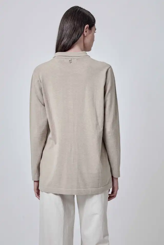 Cardigan con cuello, bolsillos y botones. Tejido en hilado de 45% viscosa 35% poliamida 20% pbt. El modelo viene en 4 variantes: crudo, negro, camel y celeste. El largo total de hombro a ruedo es de 62 cm en talle 2.
