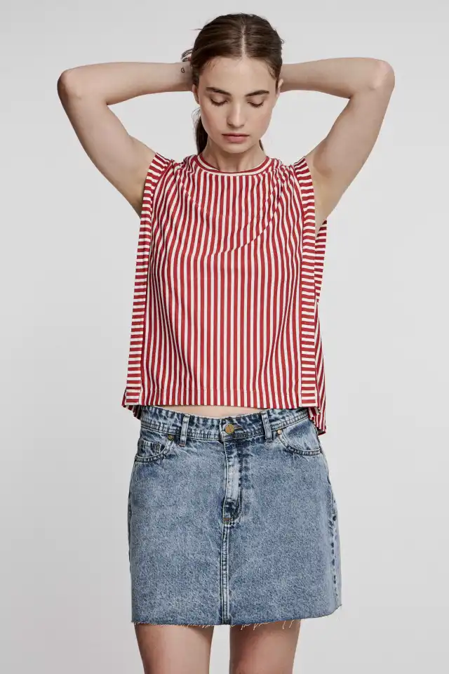 con 72% viscosa, 24% poliéster, 4% spandex. De silueta