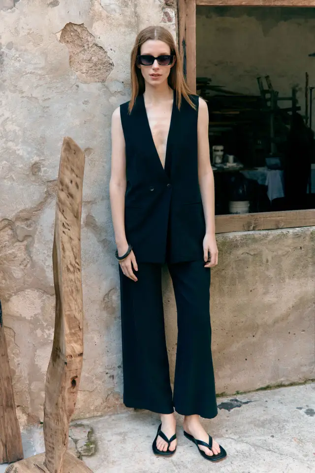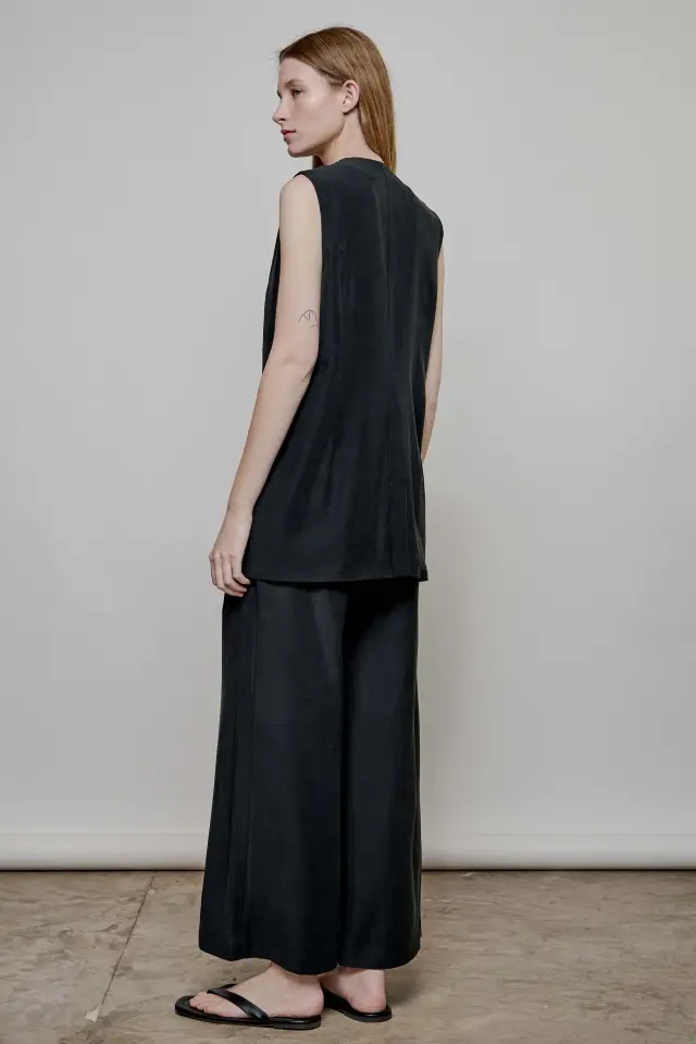 Chaleco sastrero con cuello a la base y escote V, confeccionado en 81% rayon 19% poliester. Posee bolsillos ojal en delantero. Su largo de referencia para el T2 es de 77cm.