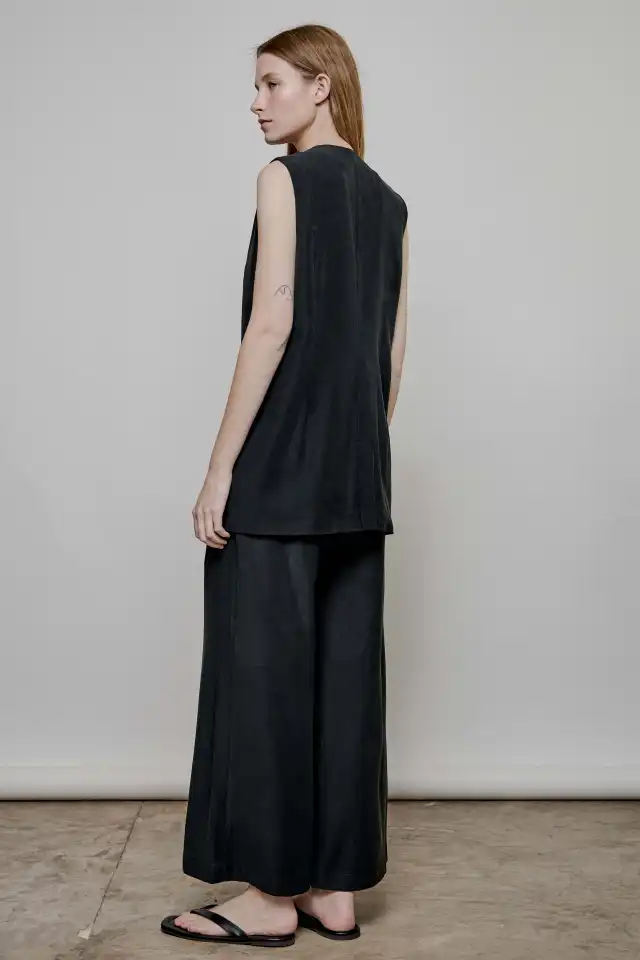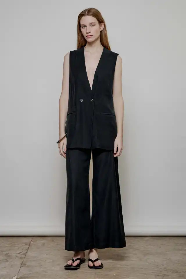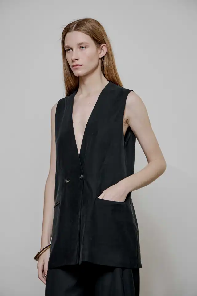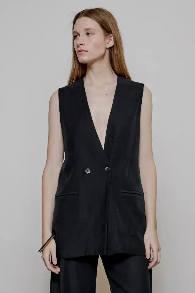 Chaleco sastrero con cuello a la base y escote V, confeccionado en 81% rayon 19% poliester. Posee bolsillos ojal en delantero. Su largo de referencia para el T2 es de 77cm.