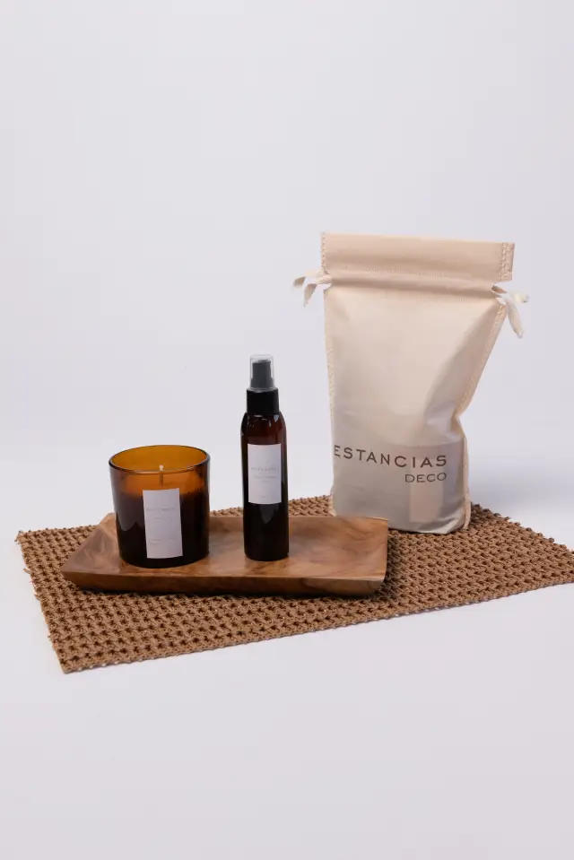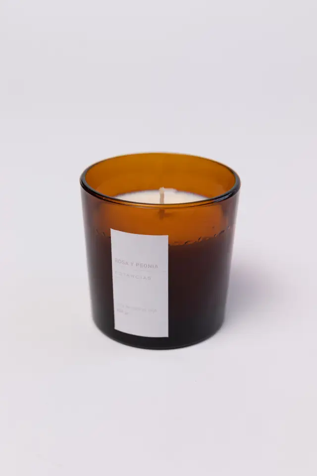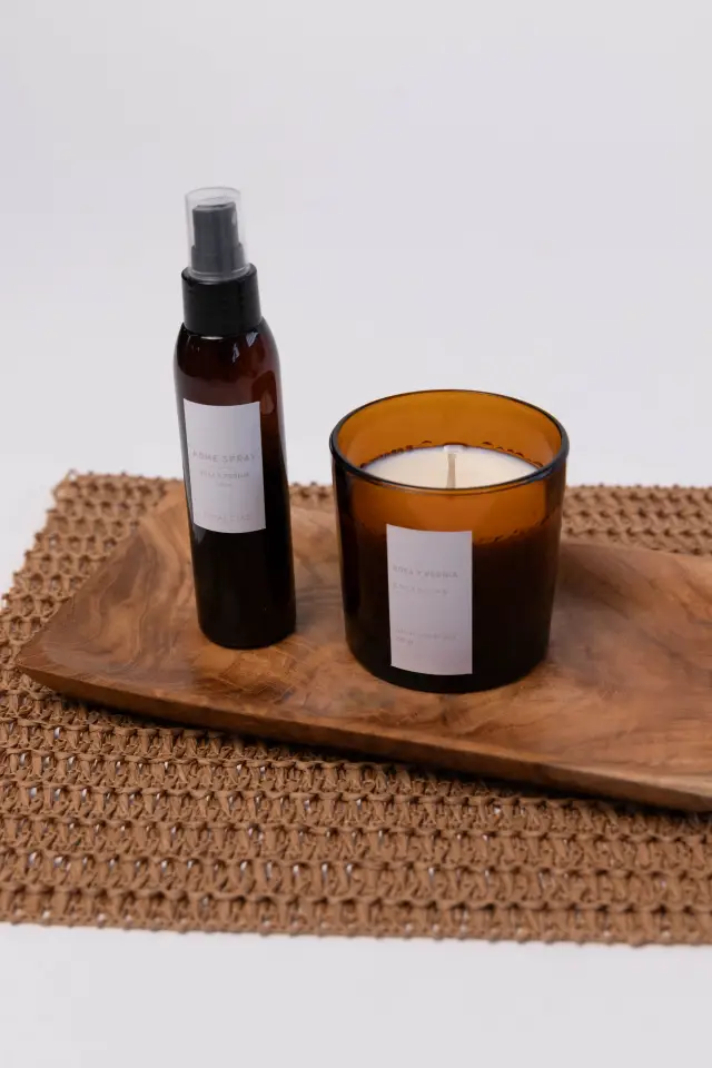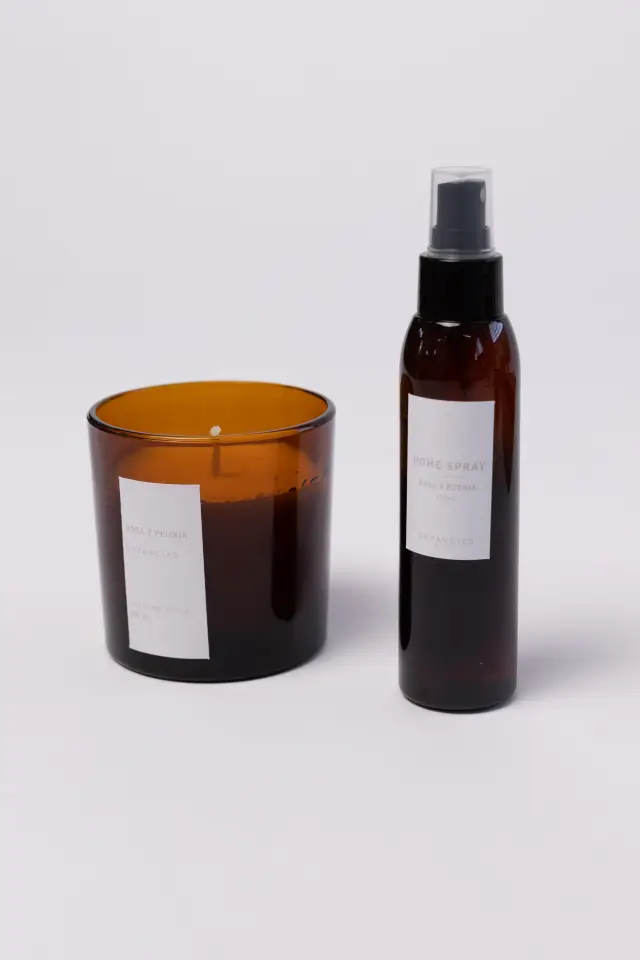 Set en color ámbar d home spray de 125ml y vela en base de vidrio. Aroma: Rosa y peonia. Único aroma disponible.