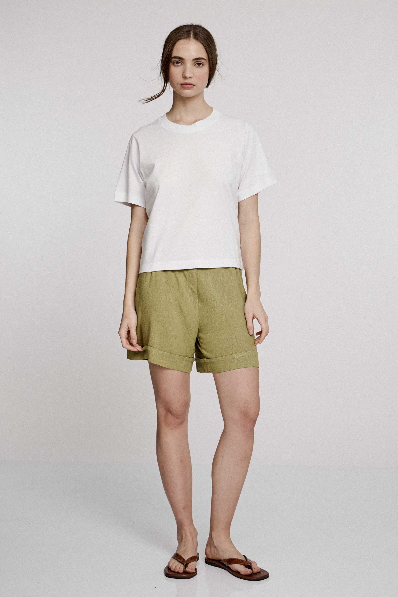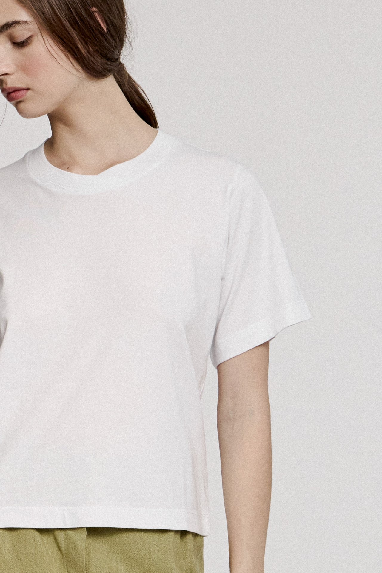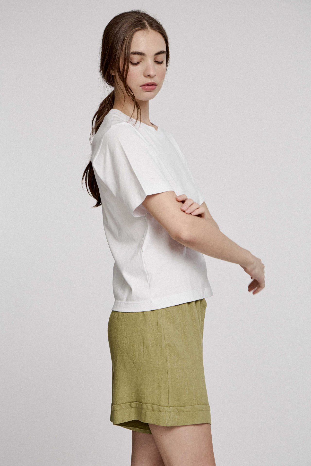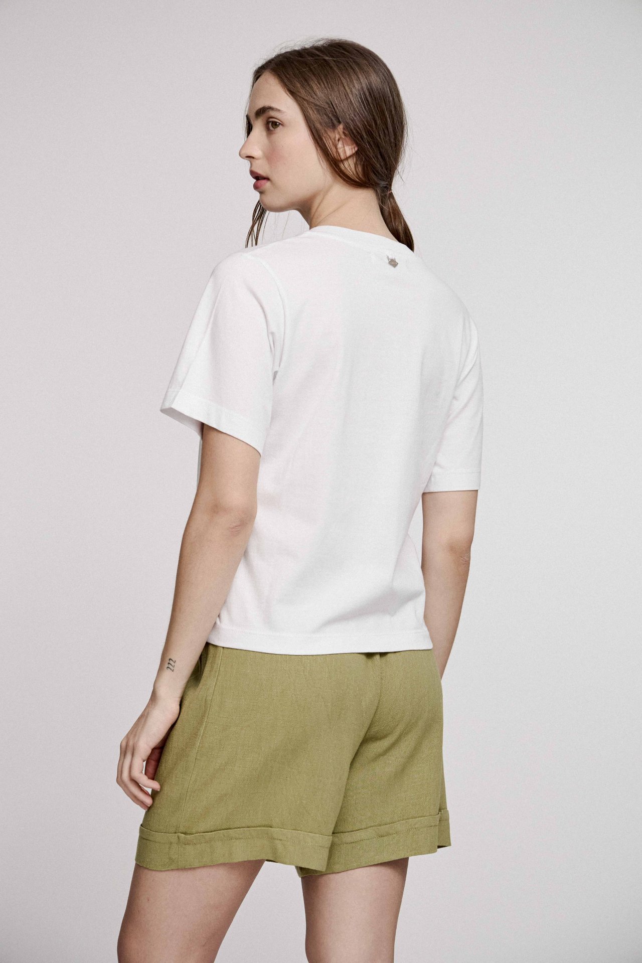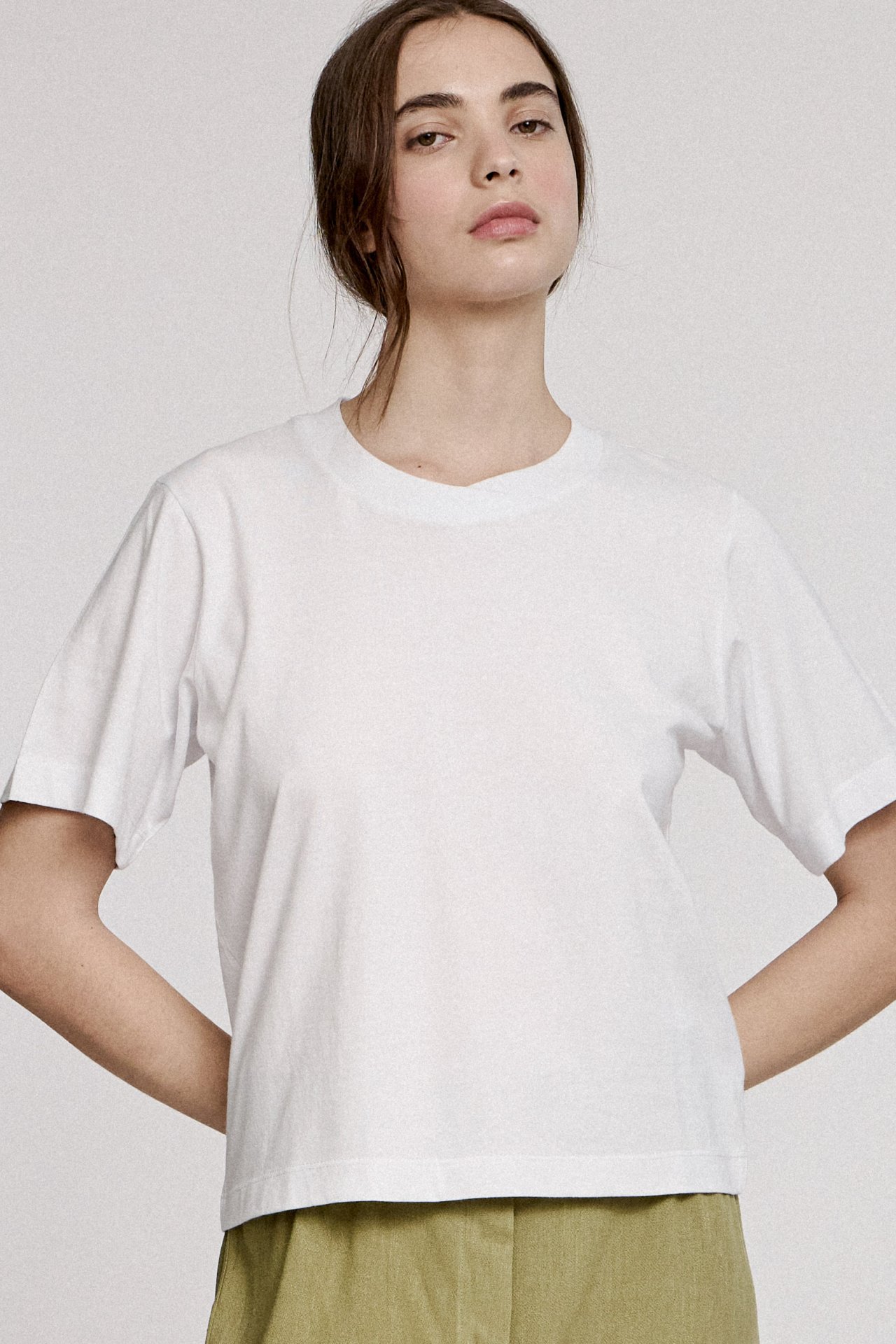 Prenda confeccionada con géneo de punto compuesto por 100% algodón. De silueta holgada y regular, no se adhiere al cuerpo, cuenta con mangas cortas amplias y un escote redondeado con cruce, realizado con rib complemento al tono.