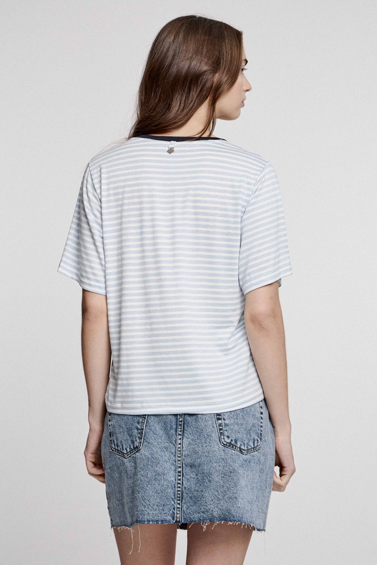 Remera confeccionada en genero de punto 72% viscosa 24% poliester 4% spandex, con una silueta regular que no se adhiere al cuerpo. Cuenta con una estampa en el frente en tono azul oscuro.