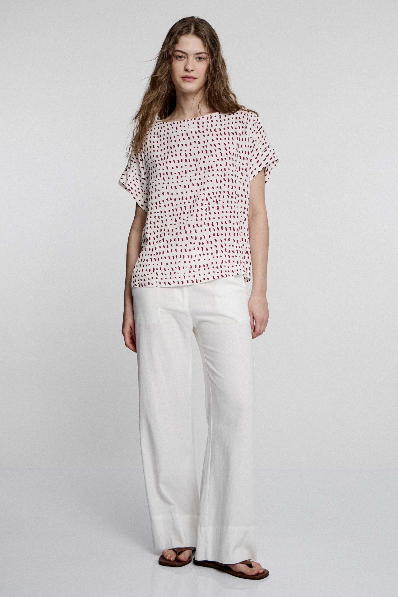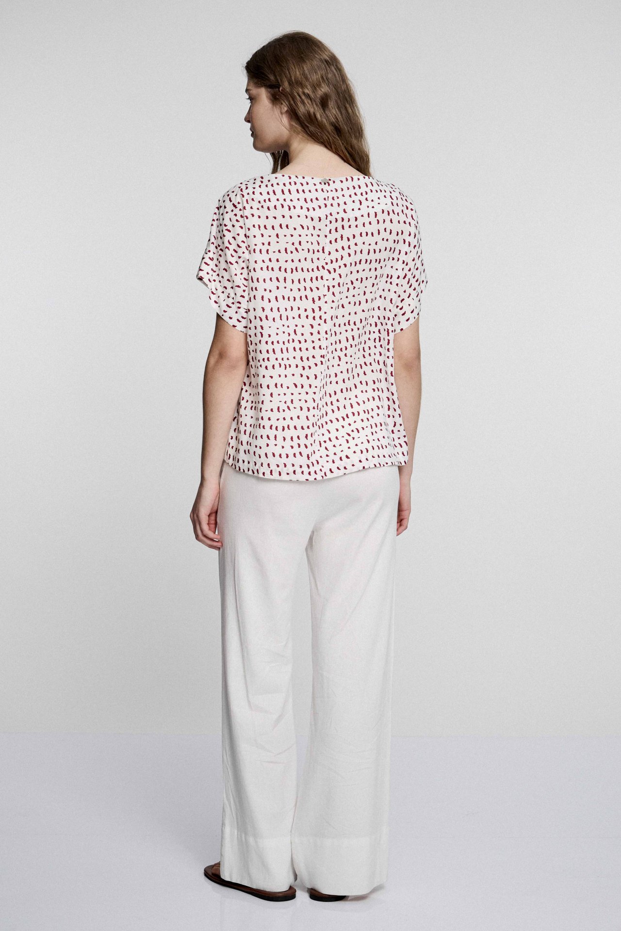 Blusa con manga incorporada y escote bote. Posee ruedo ancho y recortes en sus mangas. Confeccionada en 100% rayón estampado exclusivo estancias, textil liviano y con caída. Su calce es relajado. El modelo viene en dos variantes de color: estampado soles y estampado pintitas. Largo total de hombro a ruedo 59 cm en talle 2.