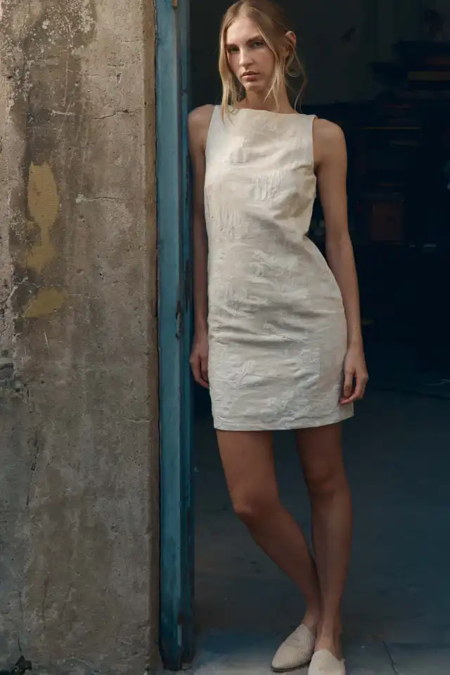 Vestido jackie con escote bote realizado en un tejido labrado color cascarilla. Confeccionado en 40% poliéster 40% algodón 20% lino. Posee pinzas dior en el delantero. El modelo viene en una única variante de color, a pesar de que hay 4 modelos distintos de jackies. Largo total de hombro a ruedo 89 cm en talle 2.