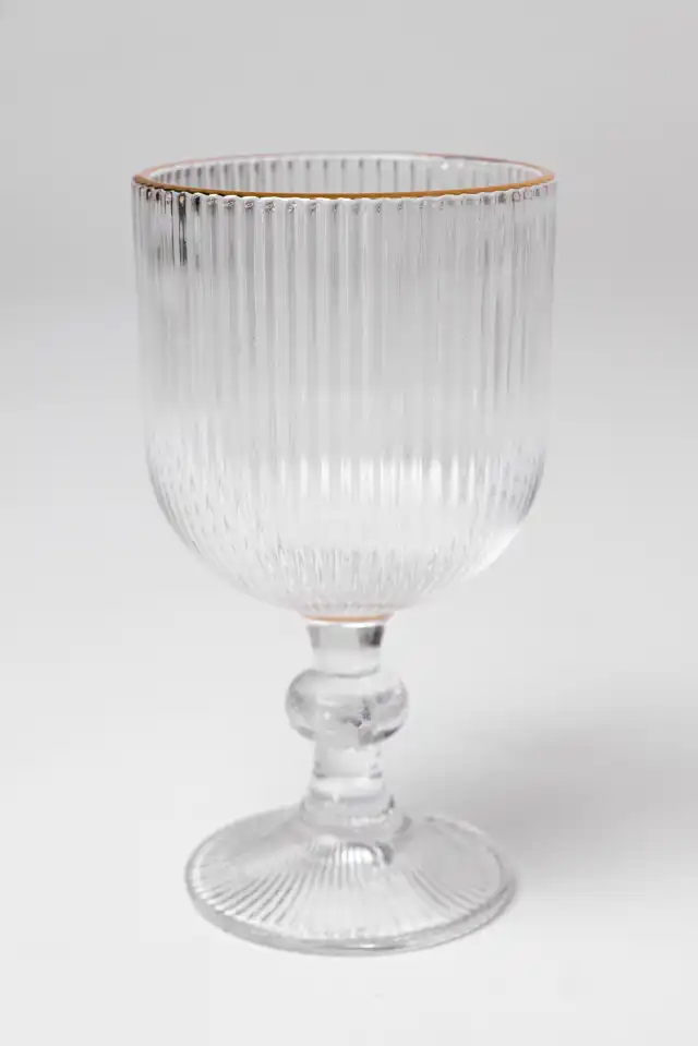 Copa de vidrio labrada con borde dorado.
