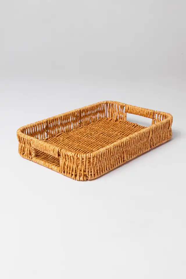 Bandeja chica símil ratán de pu. Disponible en dos tonos. Medidas: 30*20*4,5cm