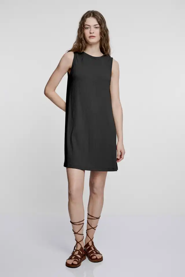vestido lyra prenda confeccionada con genero de punto compuesto por 93% rayón 7% spandex. De silueta regular, es un artículo más pegado en la zona del busto y genera una campana de slas sisas a la rodilla. Escote redondeado alto en el delantero y espalda con escote en V.