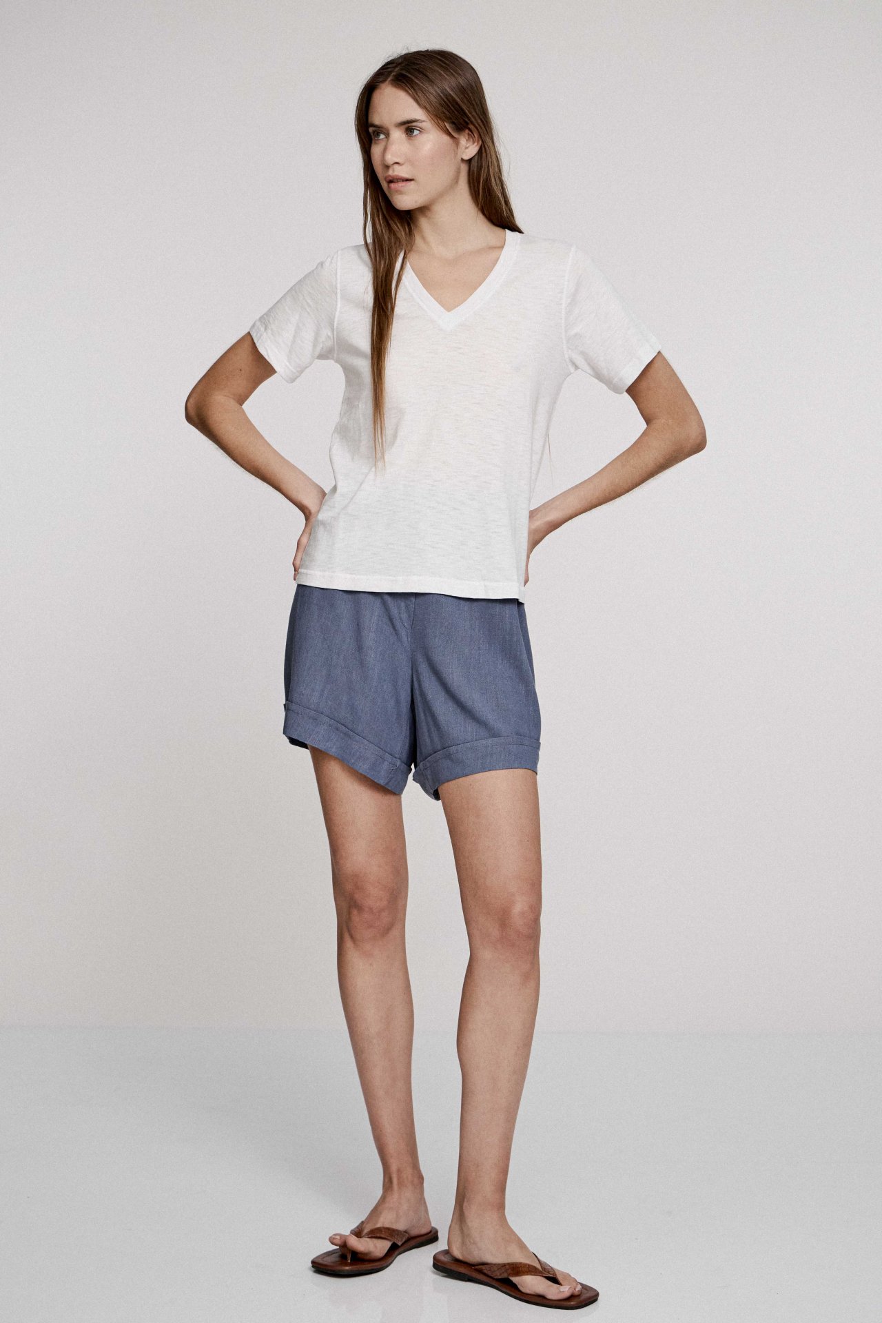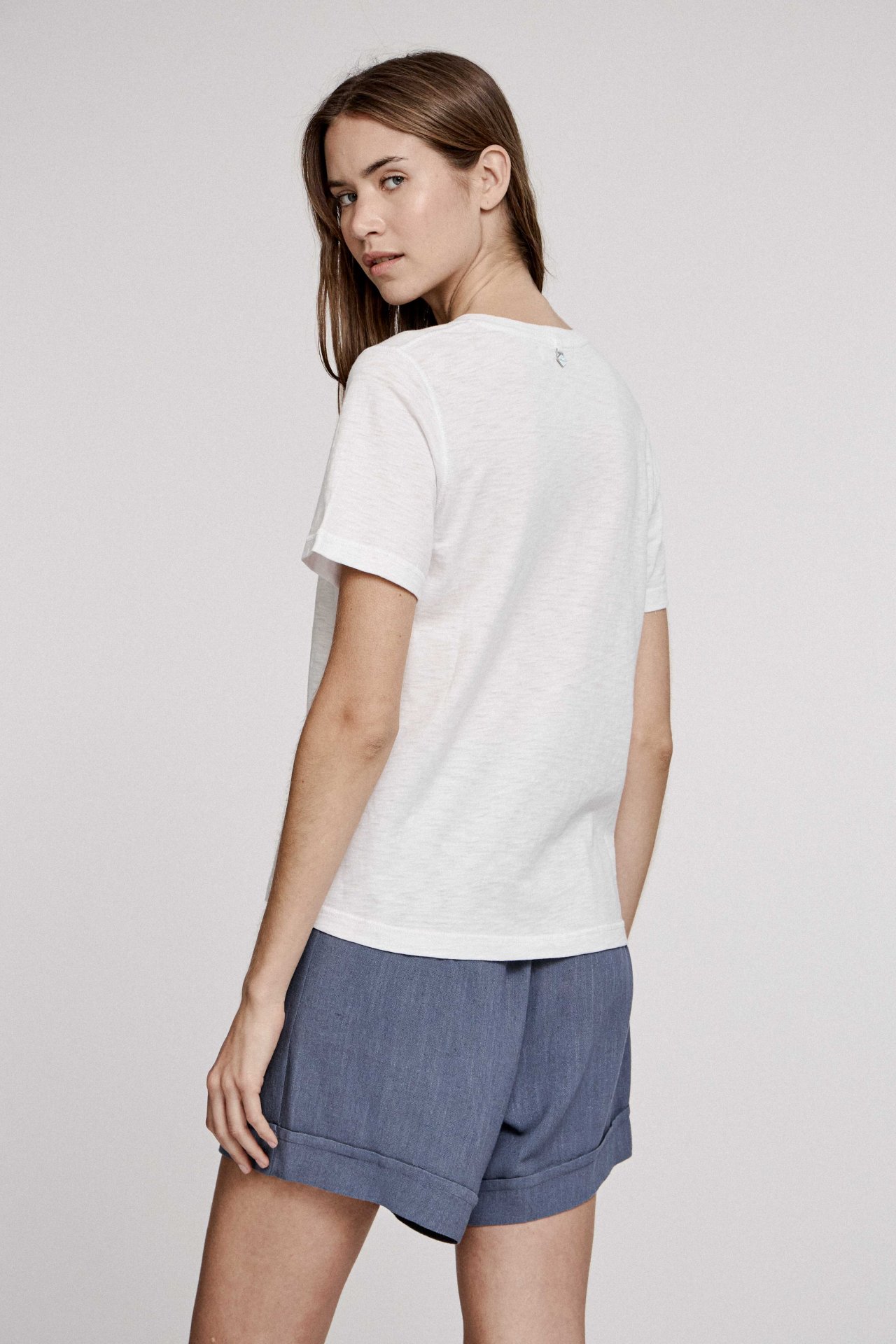 prenda confeccionada con género de punto compuesto por algodón 100%. De silueta regular, están prenda no se adhiere al cuerpo. Con cuello escote en v y mangas cortas regulares. Cuenta con un recurso de bordado al tono, en las uniones de sus piezas. Textil tramado horizontalmente. Fresco y agradable para días de calor.