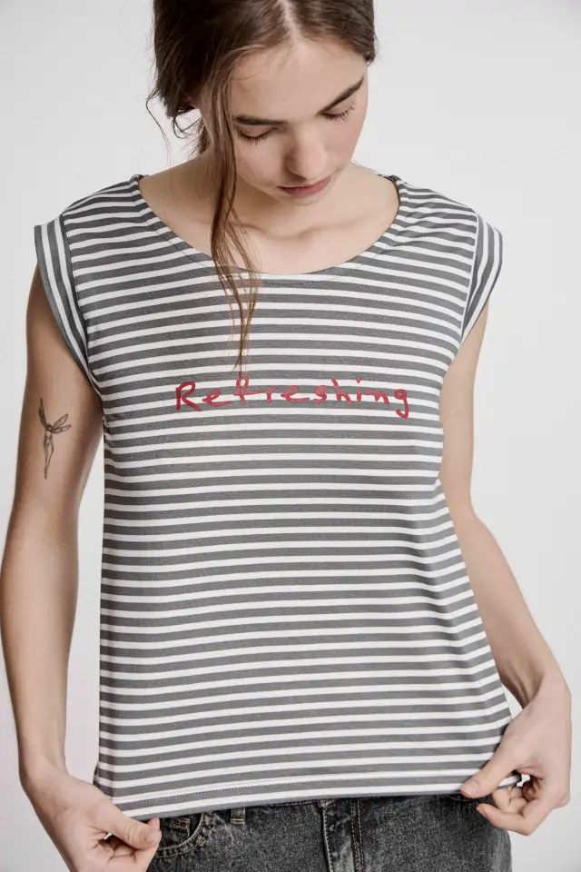 Remera fabricada en genero de punto compuesta por 72% viscosa 24% poliester 4% spandex. De silueta regular, cuadrada, no adhiere al cuerpo. Textil suave y con caída. Rayas clásicas, blancas y grises. Cuenta con una estampa en el frente en tono rojo.