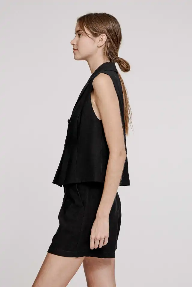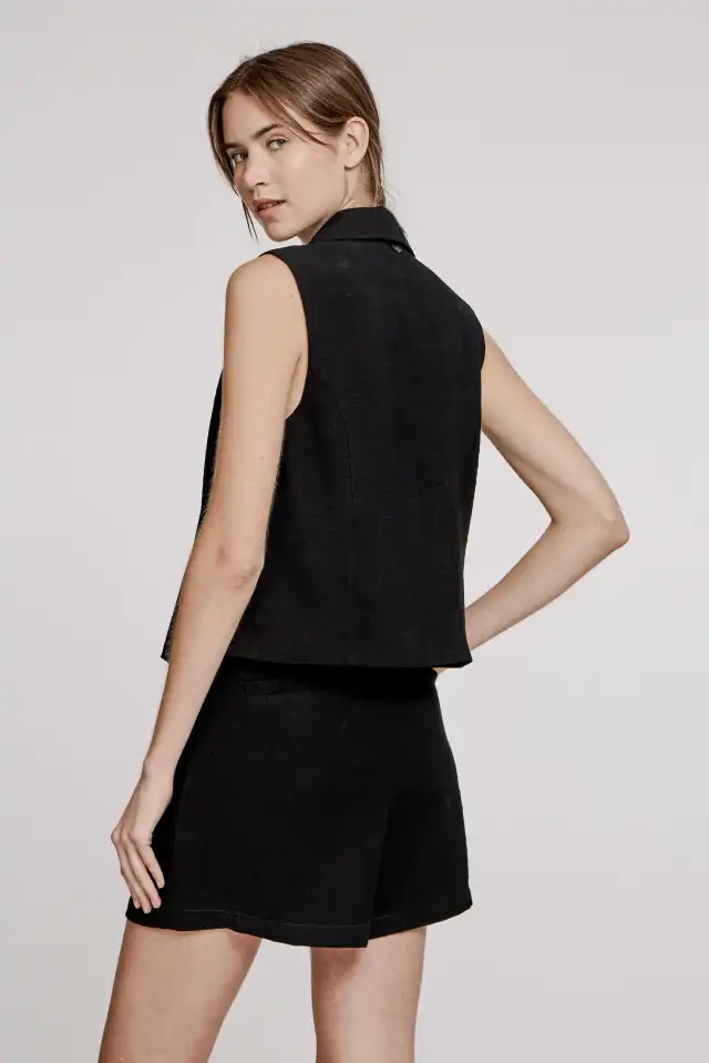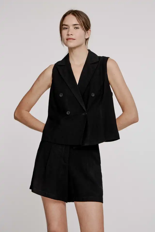 Chaleco sastrero con cuello solapa, confeccionado en sastrería con efecto flame de composición 94 % viscosa 6 % poliéster. Posee dos bolsillos falsos en la parte inferior delantera. Cruce doble con 4 botones a tono.