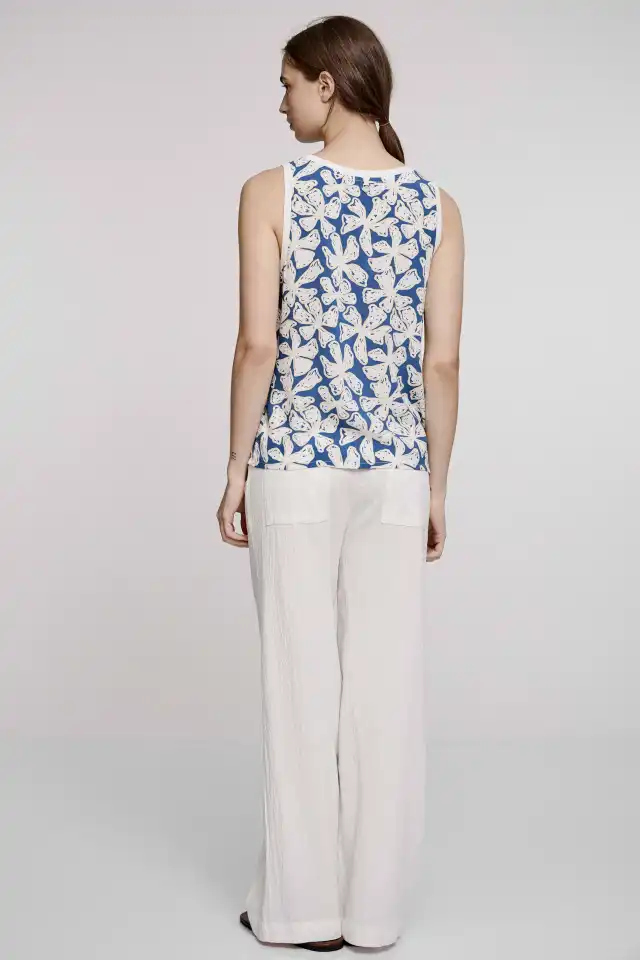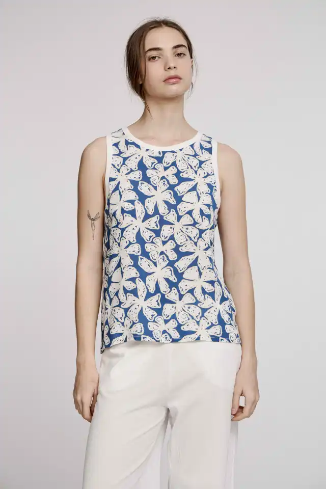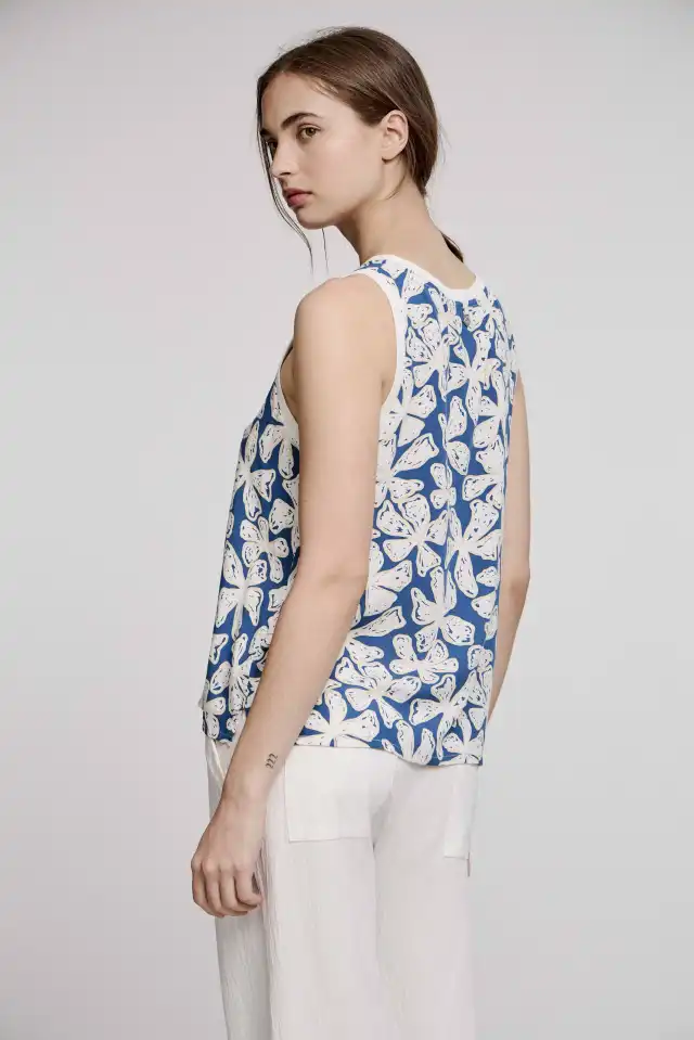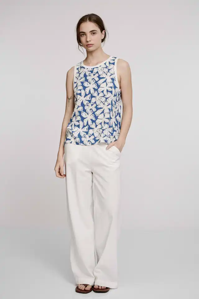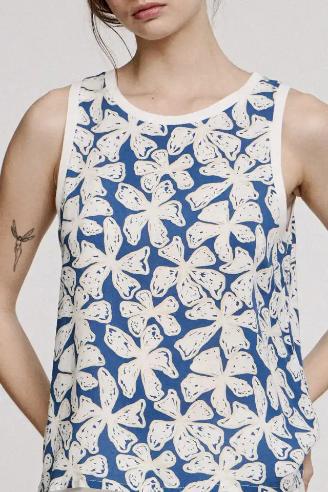 Top sin mangas de calce regular con escote levemente redondeado. Posee rib tanto en su escote como su sisa. Confeccionado en tejido 100% rayón, suave al tacto, liviano y con caída natural. El modelo viene en una unica variante de color. Largo total de hombro a ruedo 60 cm en talle 2.