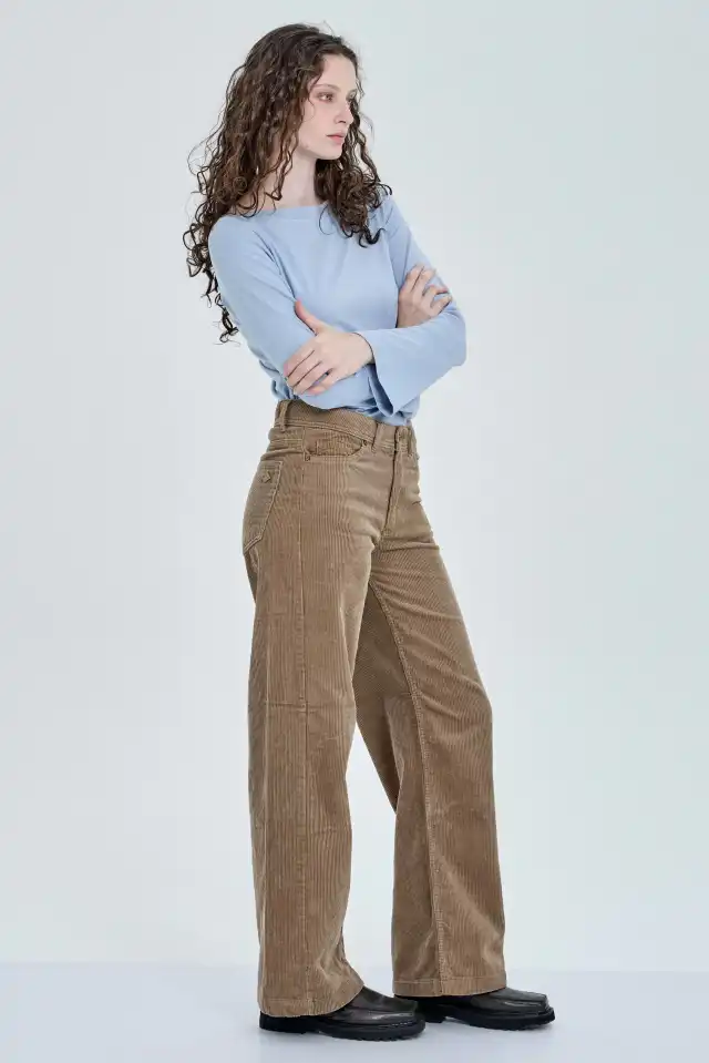Pantalón de corderoy jeanero con 5 bolsillos de calce recto y descalzado.