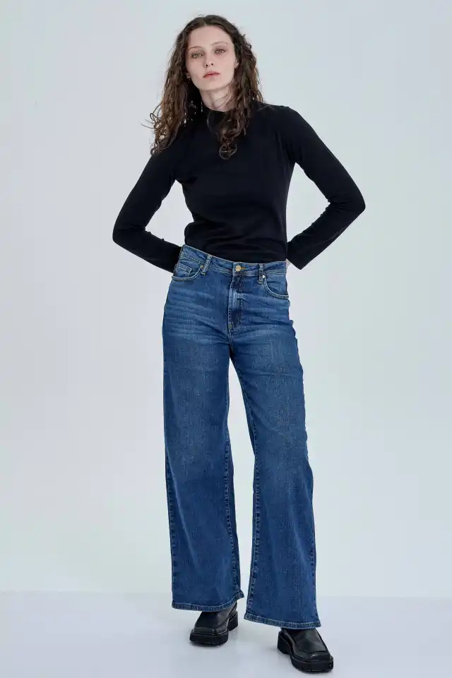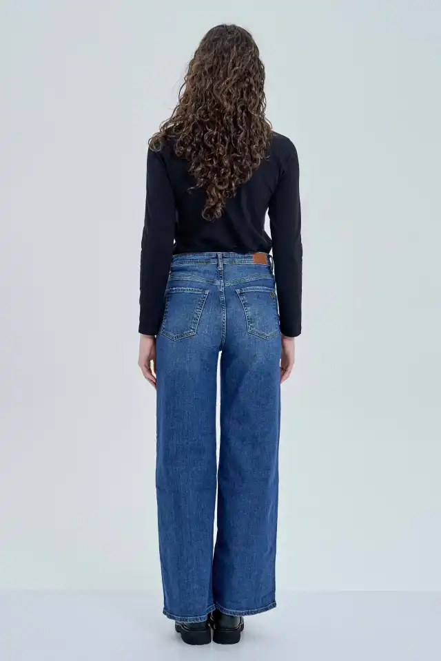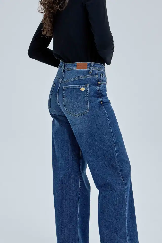 recto-slim en caderas y pierna wide-leg. Su lavado es azul intermedio, con